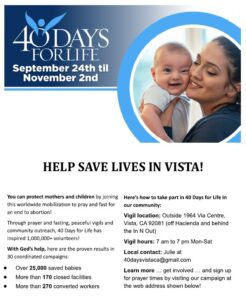 Between Wednesday, Sept. 24, 2025 through Sunday, Nov. 2, 2025, please join us praying on the sidewalk. We pray for lives to be spared – for the babies who are at risk, and for their mothers and fathers, who will experience a lifetime of regret, in need of wisdom and help at this juncture.