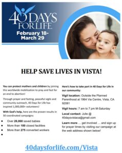 We pray for the workers in these facilities, that they will experience conversion and choose to leave this business. We pray for lives to be spared – for the babies who are at risk, and for their mothers and fathers, who will experience a lifetime of regret, in need of wisdom and help at this juncture. There are resources that you can print on our web page. See “Pro Life Resource Guide North County.” You may provide this resource to any person who approaches you asking for free pregnancy and women’s health resources.