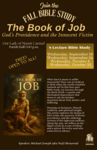 All are welcome to a 4-part lecture fall bible study, on “The Book of Job” at Our Lady of Mt. Carmel in San Diego. The bible study is being taught by Dr. Michael (Naj) Mouawad, a bible scholar who has taught scripture for two decades at St. Ephrem and St. Margaret.