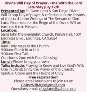 Fr. Dave Leon and the San Diego Divine Will Group will be hosting a Day of Prayer on Saturday July 12 at St. John the Evangelist Catholic Church in Encinitas, with Mass at 8am and check in at 9am. The first talks will begin at 9:30am and will include: “Praying to Know and Live in God’s Will”, “One in Christ”, “Unity”, and “Spiritual Union and the Height of Unity” along with some personal testimonies. The final blessing will be at 2pm.