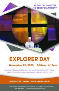 On Saturday, Nov. 22, 2025 the Diocese of San Diego is hosting an Explorer Day with the Director of Priestly Vocations, Fr. Marc Gandolfo for those men who are interested in exploring a possible vocation to the priesthood. The day will be held at St. Francis Center on the campus of the University of San Diego from 8:30 a.m. to 4:15 p.m.