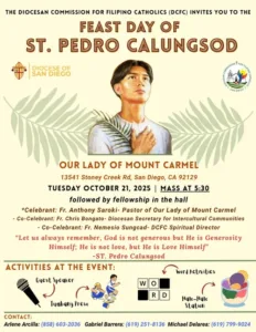 All are welcome to celebrate the Feast Day of St. Pedro Calungsod on Tuesday, October 21, 5:30pm Mass, at Our Lady of Mt. Carmel in San Diego. A reception will follow in the parish hall.