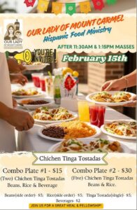 Please join us for our delicious Chichen-style Chicken Tinga Tostadas sale on Sunday, Feb. 15 after the 11:30am and 1:15pm Masses at Our Lady of Mt. Carmel in San Diego! Rice, beans, and drinks are also available for purchase.