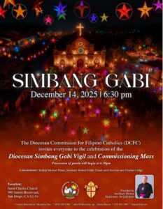 All faithful are invited to join the Filipino Catholic community for this beautiful diocesan celebration that lights the way to the birth of our Savior. Auxiliary Bishop Ramón Bejarano will bless the candles and star-shaped lanterns, known as “parols,” that will symbolically light the way to Christ as they accompany Mary awaiting the birth of her Son. Bishop Michael Pham and Auxiliary Bishop Felipe Pulido will be the concelebrants.