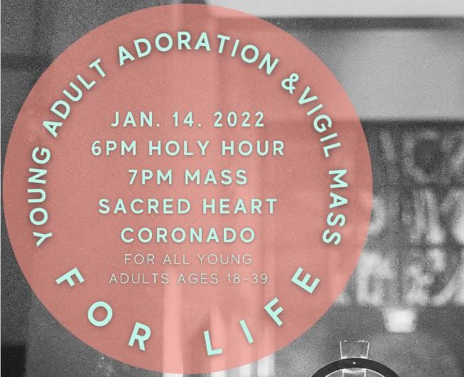 The San Diego diocese’s Office for Young Adult Ministry, in collaboration with the Office for Life, Peace and Justice, will host a Young Adult Holy Hour and Vigil Mass for Life. Auxiliary Bishop Ramón Bejarano will preside. The event, which is open to Catholics ages 18 to 39, will be held on Friday evening, Jan. 14, at Sacred Heart Parish in Coronado.